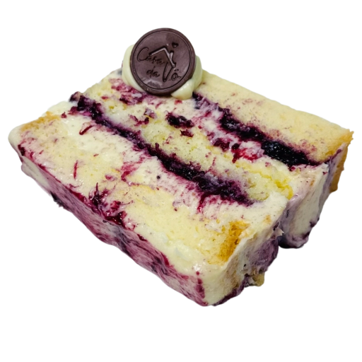 Massa de pão de ló, recheada com creme de 4 leites e geleia artesanal de frutas vermelhas.