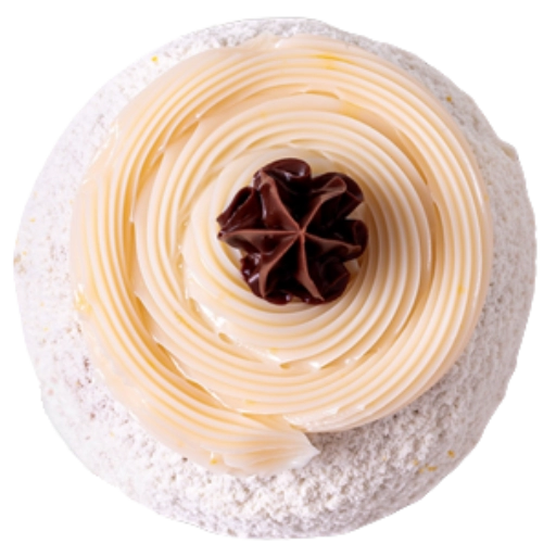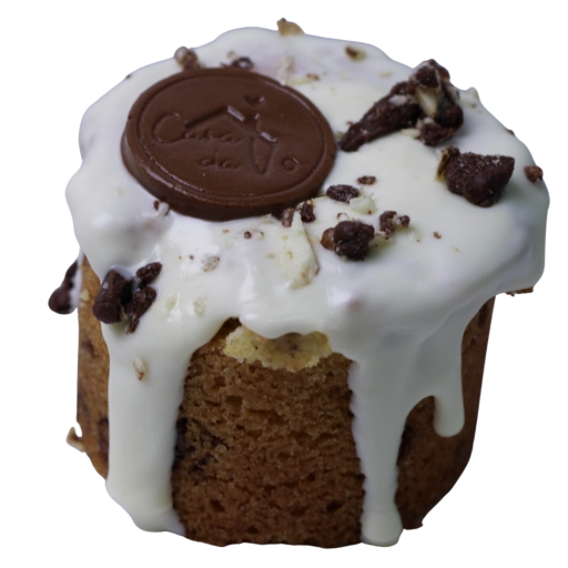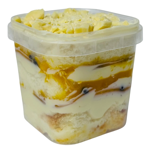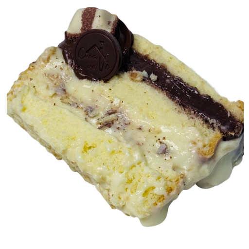 Massa de pão de ló, recheada com ganache de maracuja, ganache e pedaços de chocolate branco.
