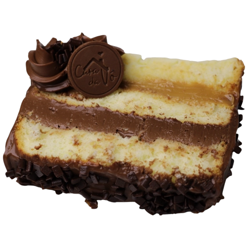Massa de pão de ló, recheado com Doce de Leite e Chocolate meio amargo.