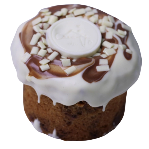 Bolo de baunilha com cobertura de chocolate branco Laka.