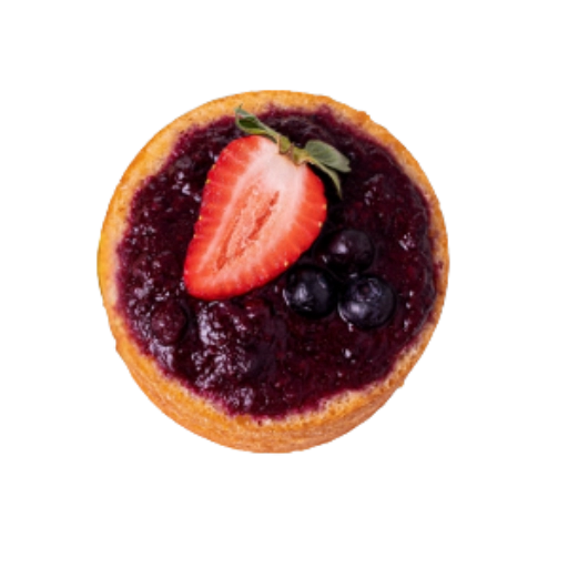 Bolo de baunilha, com cobertura de geleia artesanal de frutas vermelhas.