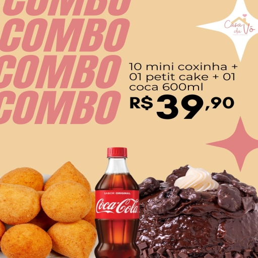 10 MINI COXINHA + 1 PETIT CAKE + 1 REFRI 600ML.